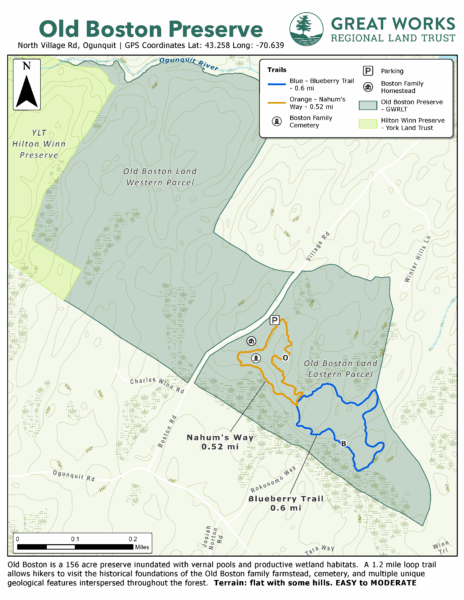 Old Boston Preserve is a 156-acre preserve inundated with vernal pools and productive wetland habitats. A 1.2-mile loop trail allows hikers to visit the historical foundations of the Old Boston family farmstead, cemetery, and multiple unique geological features interspersed throughout the forest.